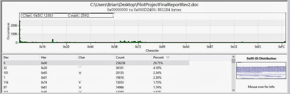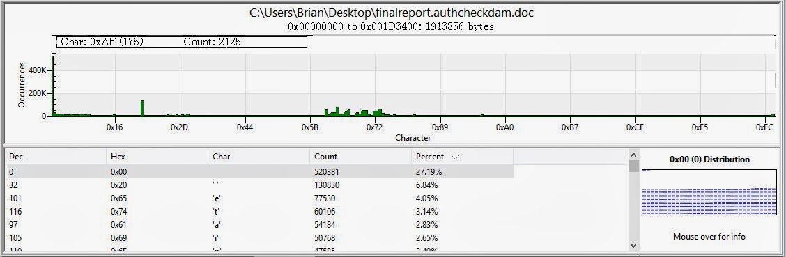 To explain this in simpler terms, if a "normal" file is made up of "01189998819991197253" (7 occurrences of 9), a TrueCrypt file will be made up of "01234567890123456789" (each character occurring only twice). With smaller TrueCrypt volumes the percentage of character occurrence is close to being "random", but it is not perfect. The highest percentage of character occurrences that I have seen in testing is 0.47%. As the size of the volume increases though, the percentage of character distribution is more level at 0.39%. I have seen tools demonstrate the "randomness" on a scale of 1 to 10, 1 to 8, and even 0 to 1, with different values correlating to how random the data is. Once again, for the purposes of this blog post, I prefer to use Hex Workshop to demonstrate the distribution. Below are three examples from random Word documents I downloaded from the web, three examples from smaller TrueCrypt files (292KB) and two examples from TrueCrypt larger files (1GB). Even though the actual number of times the characters appear varies, what we are looking for is the percentage of how many times those characters occurs.